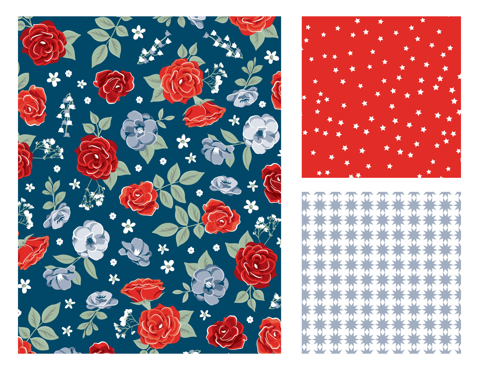 These scrapbook paper patterns were meant to feel festive for the Fourth of July without being overtly patriotic. Red, white, and blue flowers feel summery and fresh. The firework pattern could just as easily represent granny's quilt. All art and patterns were drawn digitally in 2023 for Close To My Heart.
