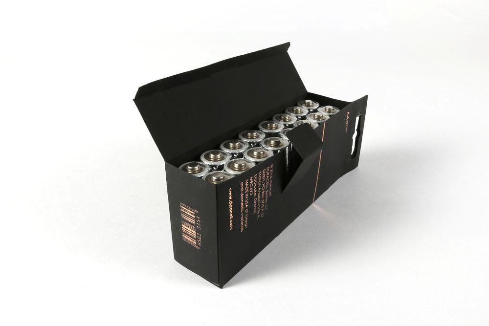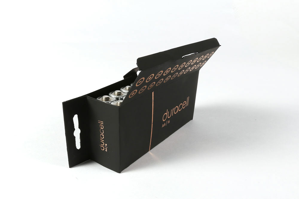 This redesign of Duracell's packaging is sleek, intuitive, and environmentally friendly. The sturdy single side open box allows for more strength with less material, It opens like a traditional box for easy access and compact storage.